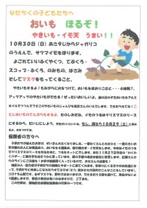 今年度も5月28日、地区の児童19名がサツマイモの苗を1人4本ずつ、高齢者を中心としたジャガリコ農園の会の会員など30名から指導を受けながら植えつけました。植えつけたサツマイモは、イノシシなどの被害もなく、順調に成長し、10月30日好天のもと、児童19人、会員の高齢者23名、その他協力者が参加する中収穫することができました。