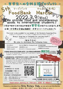 令和4年2月16日(水)12時00分から、J:COM ホルトホール大分2F「講義室」で開催することを予定しておりました留学生への食糧支援の取組「第5回フードバンクマルシェ」は、新型コロナウイルス感染症拡大の状況を鑑み、令和4年3月9日(水)に日程を変更することとなりました。